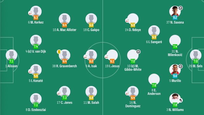 【出场阵容】利物浦首发:1-阿利松、8-索博斯洛伊、4-范戴克、5-科纳特(55'22-埃基蒂克)、6-凯尔凯兹(68'26-罗伯逊)、17-琼斯(78'73-恩古莫哈)、38-赫拉芬贝赫、10-麦卡利斯特、11-萨拉赫、9-伊萨克(68'14-基耶萨)、18-加克波替补未出场:25-马马尔达什维利、2-戈麦斯、3-远藤航、42-尼奥尼、47-拉姆塞诺丁汉森林首发:26-泽尔斯、37-萨沃纳、5-穆里略、3-内科-威廉姆斯、31-米伦科维奇、6-桑加雷、8-E-安德森、10-吉布斯-怀特、16-多明戈斯(61'21-哈钦森)、14-恩多耶(86'7-奥多伊)、19-伊戈尔-热苏斯(86'22-耶茨)替补未出场:13-维克托、4-莫拉托、23-J-库尼亚、30-博利、24-麦卡蒂、15-卡利穆恩多