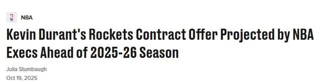 北京时间10月19日,据NBA名记Stein报道,杜兰特“越来越有可能”从火箭队得到一份续约报价低于2年1.2亿美元顶薪的合同。Stein称,多位薪资专家表示,火箭队给杜兰特的报价至少应比顶薪总额少4000万美元。